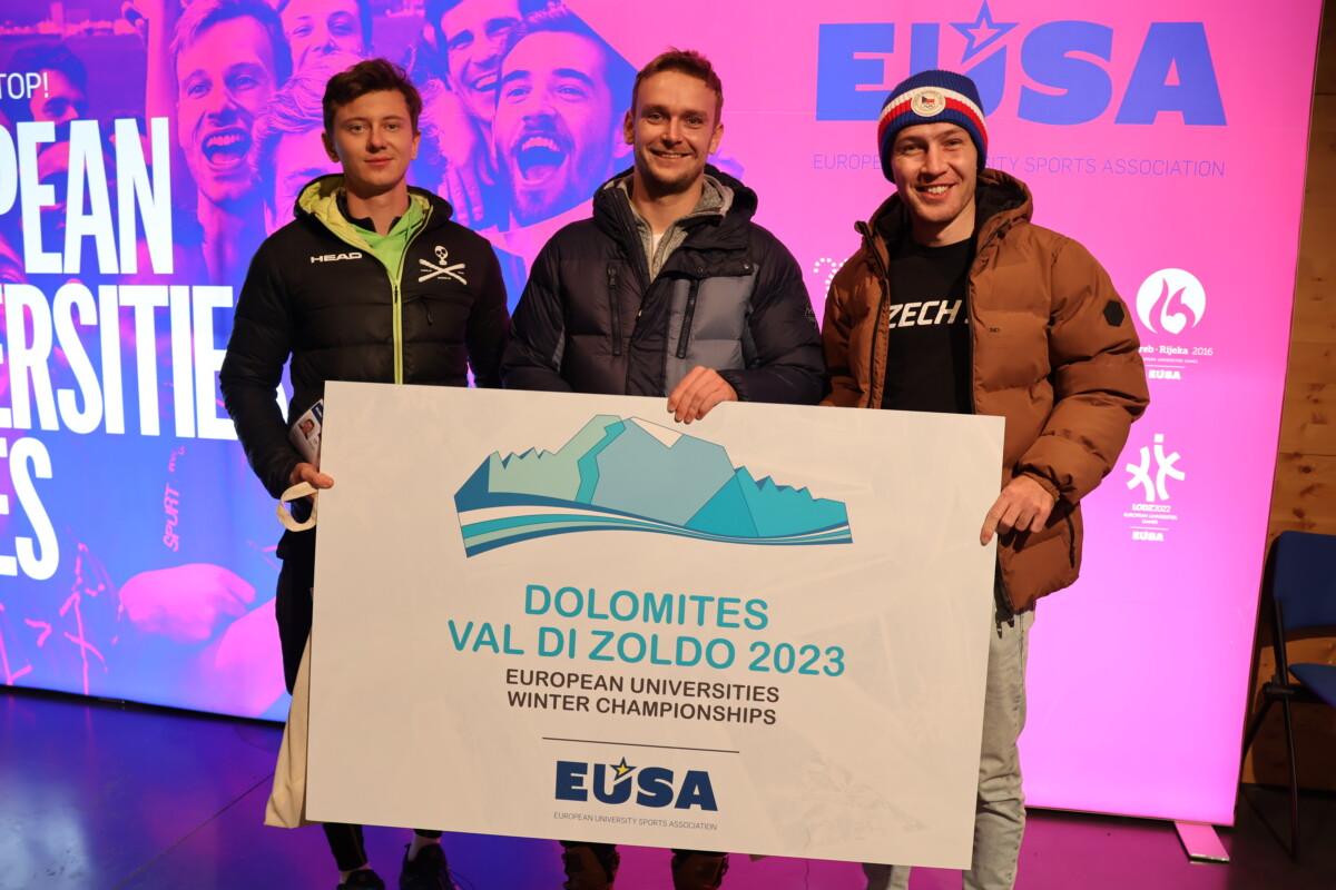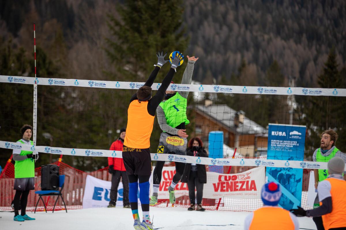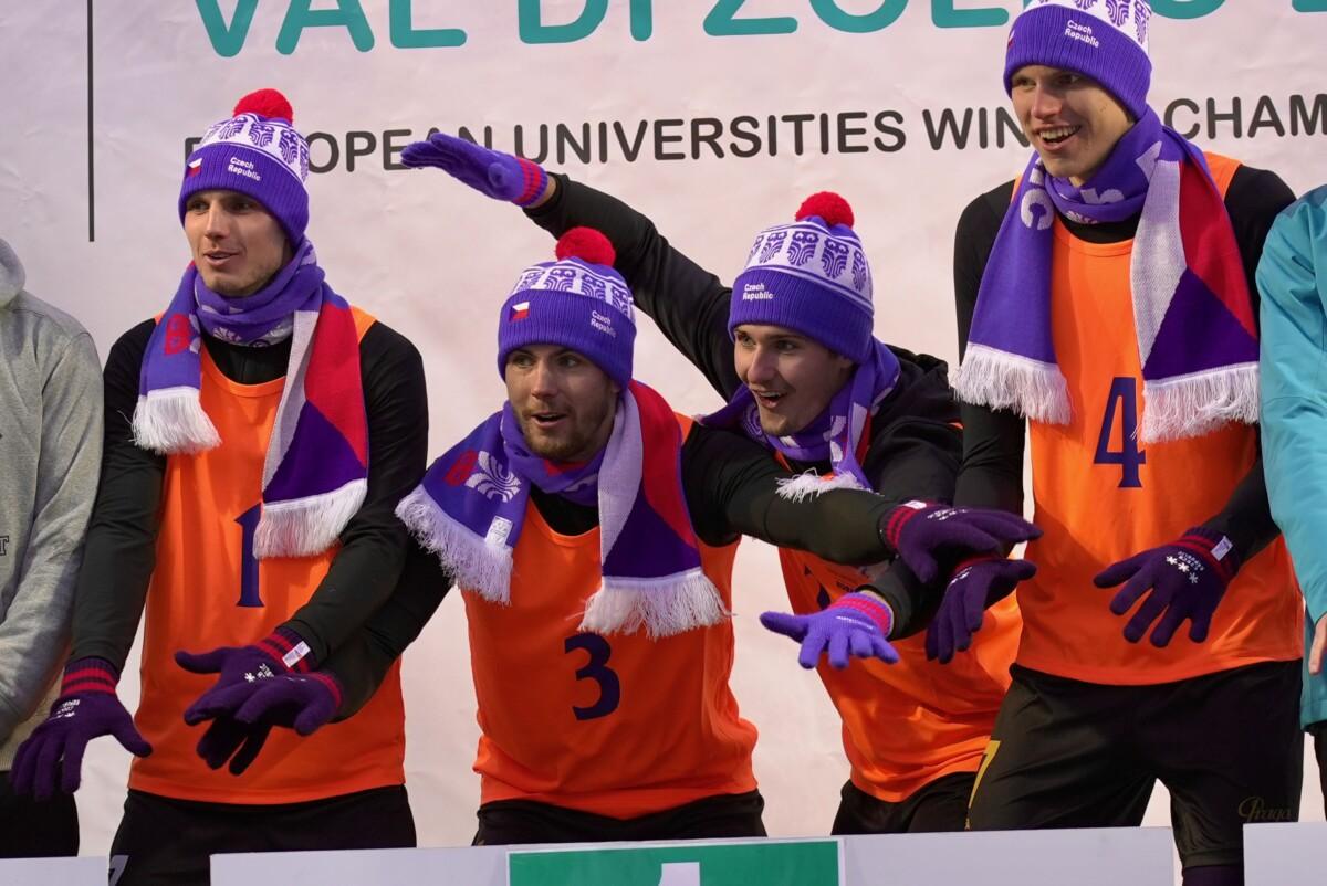 Čeští snow volejbalisté vybojovali zlato na premiérovém Mistrovství Evropy univerzit v zimních sportech. Tým ve složení Jan Mrkous, Tadeáš Trousil, František Pihera, Tomáš Semerád ve skupině utrpěli pouze jedinou porážku od týmu z rakouského Klagenfurtu, kterou jim však Češi oplatili ve finálovém zápasu a radovali se tak z celkového vítězství. Finálový zápas českých studentů zVŠCHT a týmu Univerzity v Klagenfurtu byl do poslední chvíle napínavý. První set vyhráli Rakušané 15:9, druhý set se naopak lépe vydařil našim, kteří zvítězili 15:6. Rozhodoval třetí set, ve kterém chemici z Prahy přehráli soupeře 15:12 a radovali se z historického zlata! Evropské mistrovství pod záštitou EUSA proběhlo v předvánočním termínu v italském středisku Val di Zoldo ve dnech 17. až 22. prosince. Kromě snow volejbalu bylo na programu také alpské lyžování a snowboarding. Česká asociace univerzitního sportu vyslala na soutěž tým snow volejbalistů z VŠCHT a dva zástupce alpského lyžování. Tomášovi Potštejnskému z Technické univerzity v Liberci a Dominikovi Kezniklovi z Masarykovy univerzity se však ve vysoké konkurenci příliš nedařilo. Na startu slalomu a obřího slalomu se objevovala také jména z nominací na Olympijské hry 2026 v italském Miláně – Cortině d’Ampezzo. V rámci programu bylo naplánováno také EUSA Forum 2023, na kterém vystoupil zástupce České asociace univerzitního sportu Přemysl Dušek, který informoval vedení EUSA a ostatní zástupce národních univerzitních sportovních asociací z celé Evropy o aktivitách ČAUS a zájmu o zimní sporty ze strany studentů v Česku. VÝSLEDKY Alpské lyžování Obří slalom 1. Arne Ackermann (SUI) Snow volejbal Kompletní výsledky VŠCHT (CZE) FOTOGALERIE Foto: EUSA