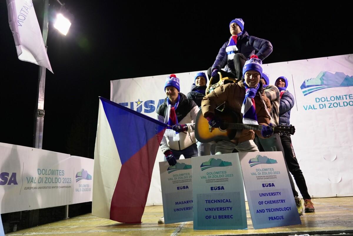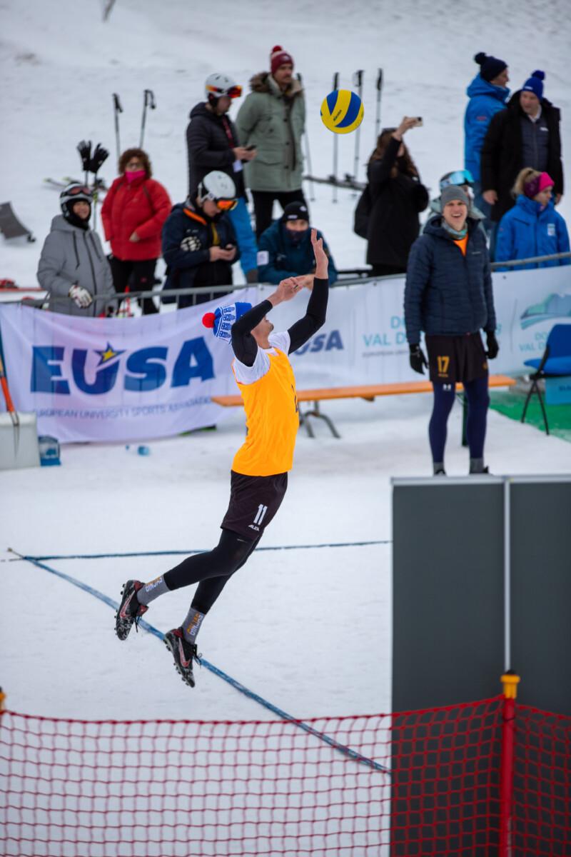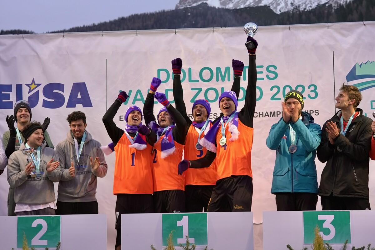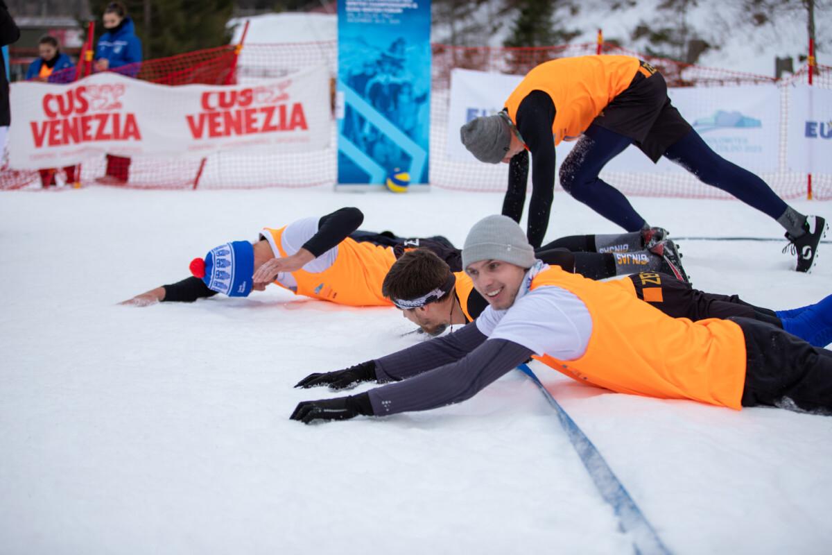 Čeští snow volejbalisté vybojovali zlato na premiérovém Mistrovství Evropy univerzit v zimních sportech. Tým ve složení Jan Mrkous, Tadeáš Trousil, František Pihera, Tomáš Semerád ve skupině utrpěli pouze jedinou porážku od týmu z rakouského Klagenfurtu, kterou jim však Češi oplatili ve finálovém zápasu a radovali se tak z celkového vítězství. Finálový zápas českých studentů zVŠCHT a týmu Univerzity v Klagenfurtu byl do poslední chvíle napínavý. První set vyhráli Rakušané 15:9, druhý set se naopak lépe vydařil našim, kteří zvítězili 15:6. Rozhodoval třetí set, ve kterém chemici z Prahy přehráli soupeře 15:12 a radovali se z historického zlata! Evropské mistrovství pod záštitou EUSA proběhlo v předvánočním termínu v italském středisku Val di Zoldo ve dnech 17. až 22. prosince. Kromě snow volejbalu bylo na programu také alpské lyžování a snowboarding. Česká asociace univerzitního sportu vyslala na soutěž tým snow volejbalistů z VŠCHT a dva zástupce alpského lyžování. Tomášovi Potštejnskému z Technické univerzity v Liberci a Dominikovi Kezniklovi z Masarykovy univerzity se však ve vysoké konkurenci příliš nedařilo. Na startu slalomu a obřího slalomu se objevovala také jména z nominací na Olympijské hry 2026 v italském Miláně – Cortině d’Ampezzo. V rámci programu bylo naplánováno také EUSA Forum 2023, na kterém vystoupil zástupce České asociace univerzitního sportu Přemysl Dušek, který informoval vedení EUSA a ostatní zástupce národních univerzitních sportovních asociací z celé Evropy o aktivitách ČAUS a zájmu o zimní sporty ze strany studentů v Česku. VÝSLEDKY Alpské lyžování Obří slalom 1. Arne Ackermann (SUI) Snow volejbal Kompletní výsledky VŠCHT (CZE) FOTOGALERIE Foto: EUSA